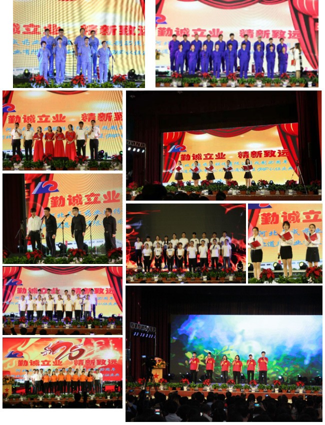 <節目名稱按圖片排列順序>1.外貿部、供應部演繹《絕代風華天成人》2.人力資源部和企管部合唱《天成人》3.渤海分公司合唱《真心英雄》4.輸液一車間舞蹈《美美噠》5.針劑一車間帶來的《走進新時代》6.固體車間小品《昨天,今天,明天》7.銷售業務部、銷售服務部帶來手語表演《感恩的心》8.道恩藥業詩朗誦《如今,我們已長大》9.銷售系統詩朗誦《改制20周年賀詞》10.生產、質量系統詩朗誦《騰飛天成》